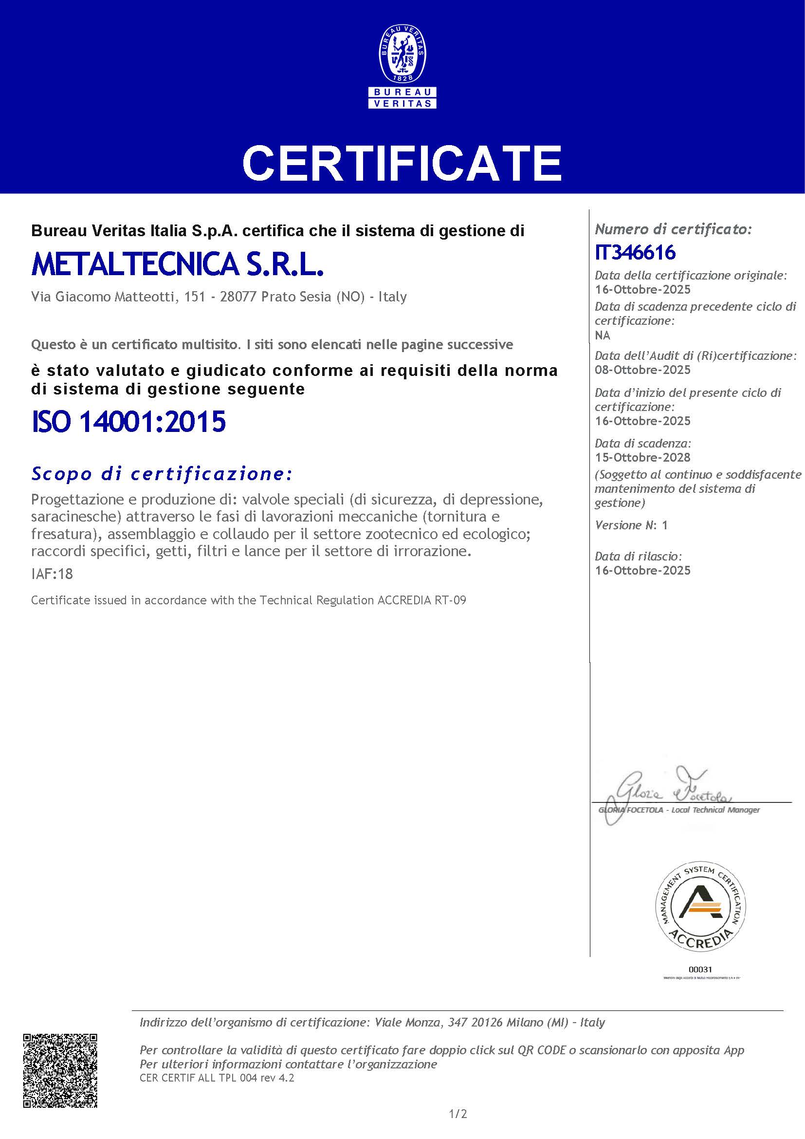 A ottobre abbiamo ottenuto la certificazione ISO 14001, rilasciata da Bureau Veritas, uno degli enti più autorevoli a livello globale. Questo riconoscimento testimonia il nostro impegno concreto nella gestione ambientale e nella riduzione dell’impatto delle nostre attività produttive.