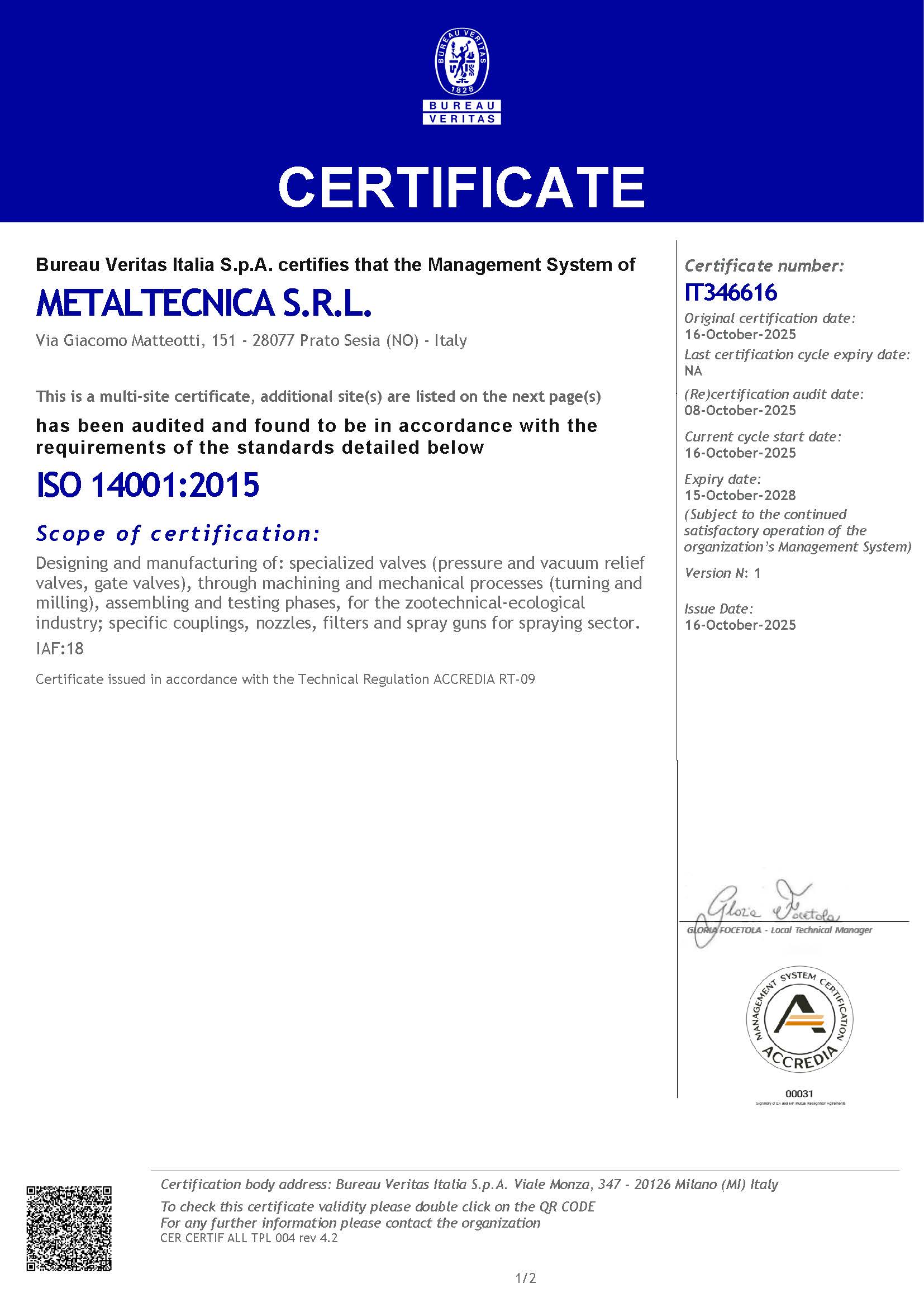 In October, we obtained ISO 14001 certification, issued by Bureau Veritas, one of the most authoritative certification bodies worldwide. This achievement reflects our concrete commitment to environmental management and to reducing the impact of our production activities.