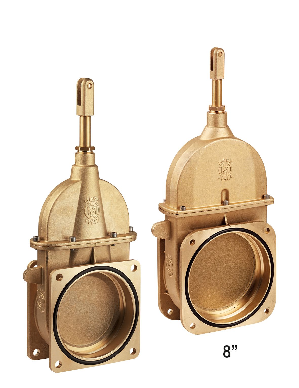 Saracinesca in ottone a doppia flangia con chiusura a cuneo. Apertura a leva manuale, con cilindri oleodinamicii o pneumatici, a semplice o doppio effetto.